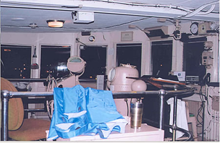 The equipment in the wheelhouse includes two radars and an electronic chart system (ECS). The steering station is located on a raised platform in the middle of the wheelhouse providing the wheelsman with a good view ahead while in close proximity to the course and rudder angle indicators.