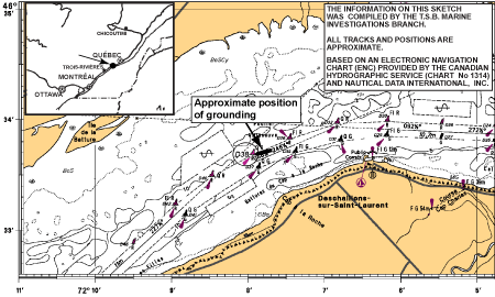 Meanwhile, the OOW phoned the master and briefed him on the situation. The master immediately came up to the bridge. The vessel continued its sheer to starboard, left the channel, and, at 0117, ran aground on the north side of the channel near buoy D38 in position 46° 33′40″ N, 072° 07′56″ W (see Figure 1). The chief engineer and the third engineer rushed to the engine room to help restore electrical and steam power to the propulsion plant. The helm was regained later but not soon enough to prevent the grounding.