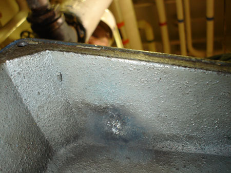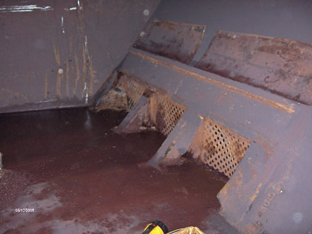The vessel's pumping arrangement includes two bilge wells in the aft end of the single watertight cargo hold. The bilge wells are located on the port and starboard sides of the hold, adjacent to the aft bulkhead (in the aft end of cargo hold No. 6). The bilge wells are situated on the tank top, within the hopper, at the cargo hold's side and extend from the aft bulkhead to 4 m forward. The cargo hold pumping arrangement is linked to the ballast pumping system by a 455 mm pipe. Each bilge well has three strainer plates; 550 mm by 450 mm, with 25 mm perforations (see Photo 5).