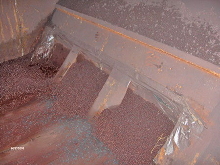 To prevent ore pellets from entering the bilge wells, the crew sealed the strainer plates using cardboard, plastic sheeting, and duct tape (see Photo 6). This was not a written procedure; however, it was common practice on board the vessel when similar cargo was carried.