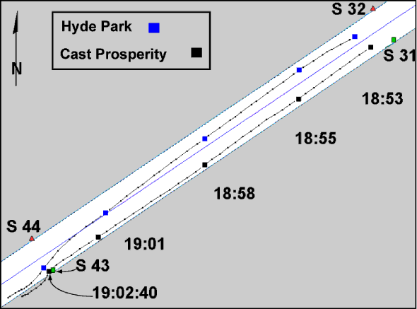 At 1841, the Cast Prosperity had closed to approximately eight cables astern of the Hyde Park and the two pilots made overtaking arrangements: the Hyde Park would move to the north side of the channel and reduce speed, and the Cast Prosperity would also reduce speed, move to the south side of the channel, and overtake the Hyde Park on its port side.