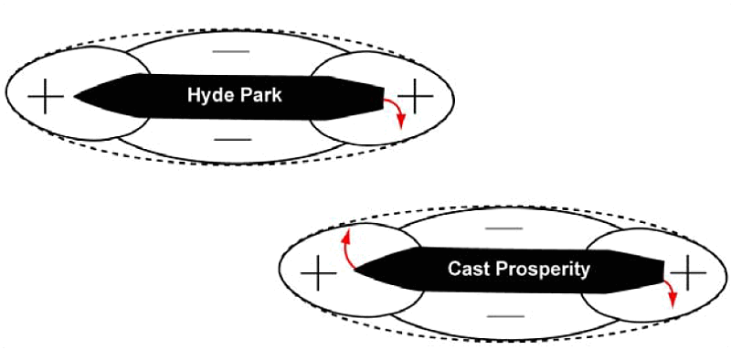 When stationary, there would therefore have been approximately 2.1 m of water between the keel of the Cast Prosperity and the channel bottom, and 1.3 m for the Hyde Park. Due to squat, however, the Cast Prosperity's actual UKC was approximately 1.7 m, and the Hyde Park's was about 0.9 m.