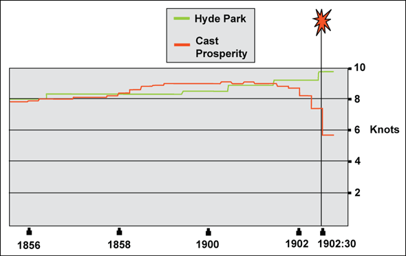 At about 1900, the Cast Prosperity pilot asked the Hyde Park pilot to further reduce speed. The Hyde Park pilot replied that he was unable to comply without losing manoeuvrability. Moreover, the Hyde Park's speed had increased from 7.3 to 8.2 knots despite the fact that there had been no change from the previous command of dead slow ahead. Despite full starboard helm at this point, the vessel continued to move towards the Cast Prosperity.