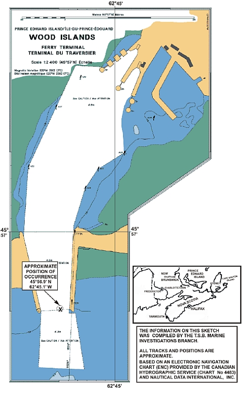 At approximately 1620 Atlantic daylight timeFootnote 2 on 27 June 2005, the ro-ro passenger ferry Confederation departed Caribou, Nova Scotia, on its final crossing of the day for Wood Islands, P.E.I. The winds were reported to be from the east at 10 knots with rippled seas. Two members of the engine room crew were carrying out maintenance to a piece of equipment in the engine room. Shortly before the vessel was due to arrive at the ferry terminal, one of the crew members left the engine room to retrieve a part to complete the job.