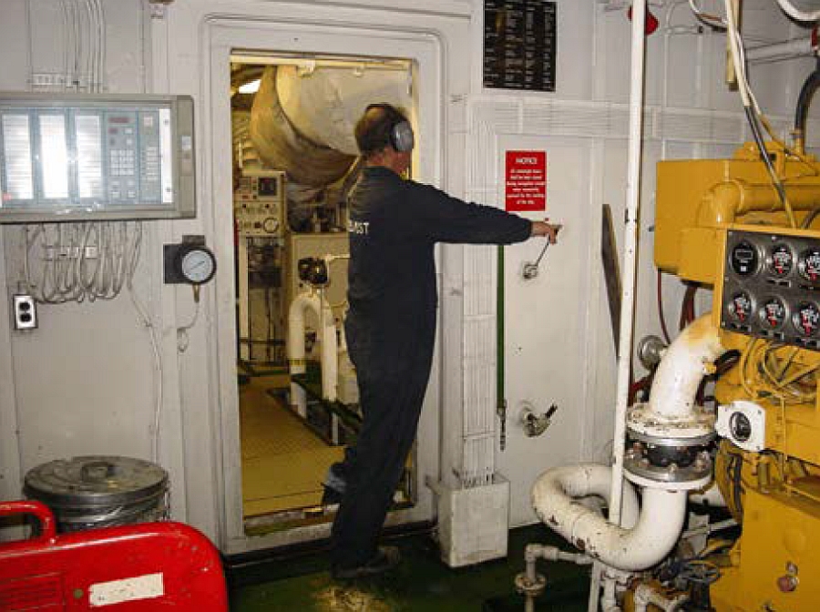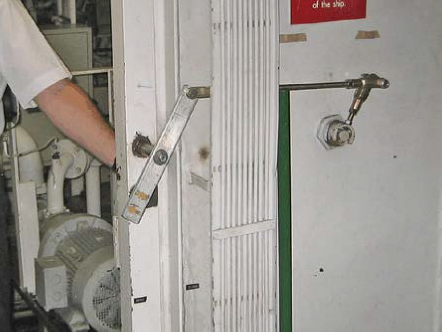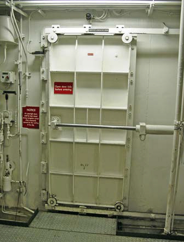 Whenever the vessel is in transit, all three watertight doors are controlled and closed automatically from a central location on the bridge. The doors may still be operated locally, but the door will only stay open for as long as the local operating lever is held in the open position. When the lever is released, the door will close.