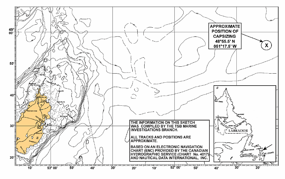 At about 1529, the vessel was on its beam ends and it continued to roll until it was completely upside down. As it rolled, all eight of the personnel walked over the vessel's side until they stood on the bottom. The vessel's emergency position-indicating radio beacon (EPIRB) was seen floating with its light flashing after the vessel capsized. The personnel remained on the bottom of the overturned boat for two hours before the vessel sank in estimated position 48°55.5′ N, 051°17.5′ W.