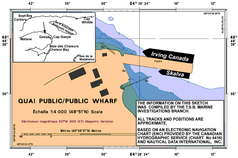 During the cooling-off period of 04 to 11 January 2006, with cargo hatches closed following the CO2 discharge into the hold, the tanker Irving Canada arrived at the port to discharge a cargo of gasoline and diesel products. On 06 January 2006, the tanker Irving Canada requested to tie up to the north side of the public wharf, 35 m from the Skalva on the south side, but the request was refused by TC Harbour Operations in consultation with TC Marine Safety.