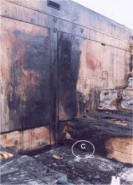When the hold was opened after the fire, an assessment showed that the wood bundles in the vicinity of the welding work had been destroyed by a smoldering, slow-burning yet intense fire. Burn patterns indicated that the fire originated from beneath the top bundles and inboard from the first row of bundles along the port side. Bundles were systematically lifted out of the cargo hold in an effort to determine the seat and cause of the fire. After four tiers of bundles were removed, burn patterns suggested that the seat of the fire had been near the gap between the first and second rows on the port side, four tiers down from the top (see Figure 2 and Photo 3). Carbonized wood and ashes were examined in that vicinity, but no indications were found as to the source of ignition.
