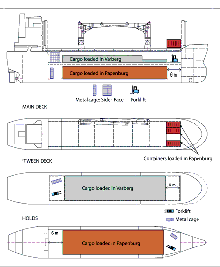 In this occurrence, the three containers on the forward part of the cargo hatch covers, as well as the cargo in the lower hold, were loaded in Germany. The cargo on the 'tween deck was loaded in Sweden. On both decks, a 6 m space was left void at each end of the hold, between the cargo and bulkheads, to allow manoeuvring room for forklifts.