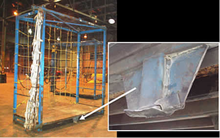 The blast displaced the cage approximately 30 cm upward and deformed one of the support feet (see Photo 3). In addition to the loud noise, shockwave, and smoke, there was a fireball nearly 1 m in diameter. A small fire on the deck was rapidly extinguished by a stevedore using a fire extinguisher.