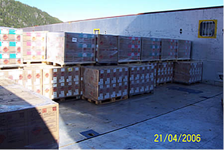 Once the pallets are on the wharf, forklifts moved them into the warehouse. Pallets would sometimes fall onto the wharf due to the poor quality of the packaging/pallets and their handling.