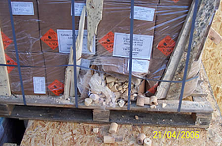 The cargo in the lower hold, from Germany, was loaded in three tiers and reached a height of approximately 3.5 m.Footnote 16 There were indications that the cargo had shifted in the lower hold (see Photo 6). Also, the wood planking on some pallets was rotten, and some pallets had missing or damaged flooring. The top of the pallets and the top tank were covered with sawdust and detritus, making it difficult to detect any spilled material. Some packaging was found perforated with cargo spilled on the deck, while other packaging was deformed (see Photo 7 and Photo 8).
