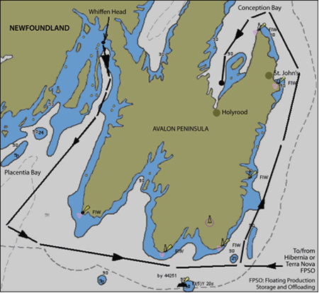 On 04 April 2006, after discharging a cargo of Hibernia crude oil at Whiffen Head on Placentia Bay, N.L., the Kometik proceeded to anchorage in Conception Bay. In preparation to effect repairs of a deck crack in way of the MARPOL lineFootnote 2 above cargo oil tank (COT) No. 4 port, and to inspect all cargo oil tanks to determine if any repairs in those tanks would also be required, all 12 COTs were washed, purged, and gas freed during the passage. The vessel was also advised that it would be required to arrive at Hibernia at 0600 on April 11. The Kometik anchored in Conception Bay on April 5 at 2024Footnote 3; an approximate track of the voyage is shown in Figure 1.