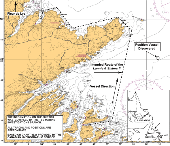 On 17 September 2006 at about 0910 Newfoundland daylight time, the fishing vessel Lannie & Sisters II, with two crew members on board, departed Lushes Bight, Newfoundland and Labrador, destined for Ming's Bight, Newfoundland and Labrador, in good weather conditions. While crossing Notre Dame Bay, the vessel took on water and was located partially submerged the next day. The body of one crew member was recovered, and the other crew member remains missing and is presumed drowned.