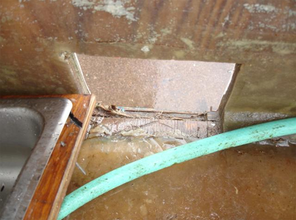 - scorched plywood surrounding the cooking stove, including an area that was burned through to the outside;