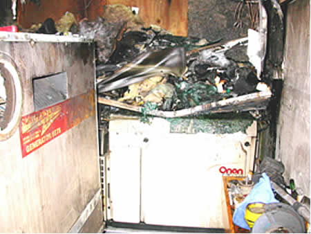 The most intense fire damage was concentrated in this vicinity and appeared to expand outward, gradually diminishing in intensity with a corresponding increase in soot deposits on the aft wall.