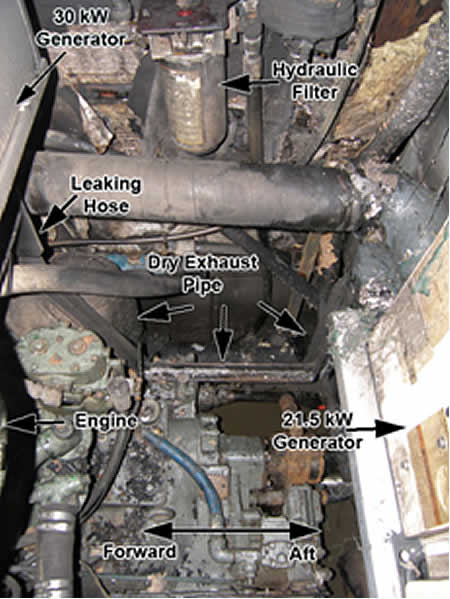 During the occurrence, a large amount of flame was originally observed aft on the starboard side of the engine room. Analysis indicates that the seat of the fire was also in this area, at the base of the dry section of the engine exhaust pipe, near the bilge. The hydraulic filter was located above this section of pipe - which was wrapped with a thin layer of insulating material - and the leaking transmission oil hose was located nearby.