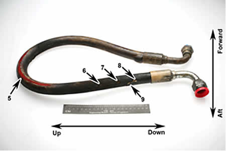 The investigation revealed that the hose was worn and may have been part of the original equipment installed on board in 1981. An examination of other hoses and lines in the engine room did not reveal any components that may have broken or failed prior to the fire.