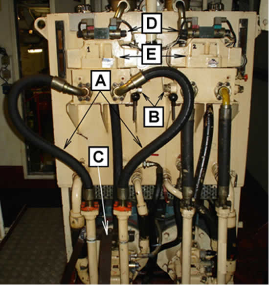 Each power unit has an electric motor and hydraulic vane pump, as well as a control system (block valve assembly including, among others, the pilot valve: see "D" in Photo 2), directional valve (see "E" in Photo 2), and its associated counterbalancing valves (see "B" in Photo 2).