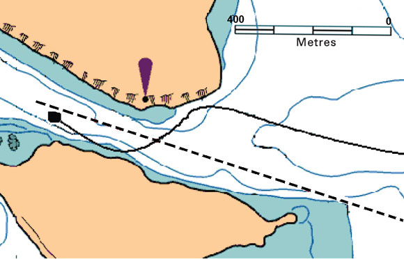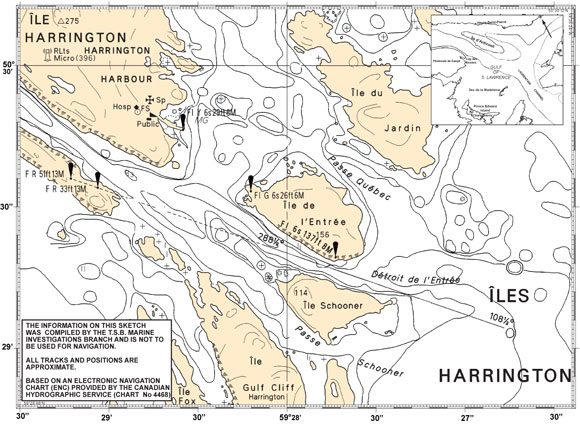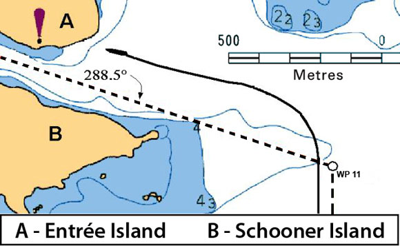 After striking Entrée Island, the vessel crossed the narrow passage, almost grounding on Schooner Island. The helmsman then saw the harbour's leading lights ahead and began to steer the vessel into the middle of the passage (see Figure 2).