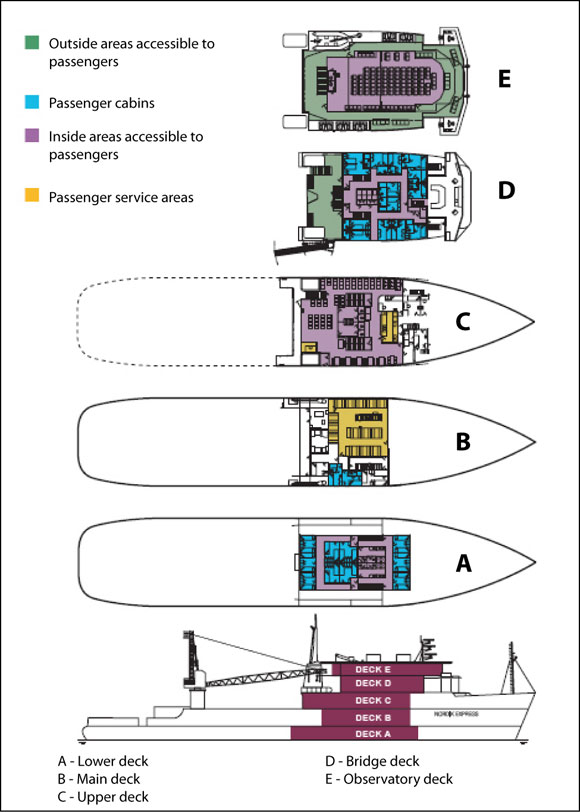 The Nordik Express is built of steel and has a lower deck, a main deck, an upper deck, a bridge deck, and an observatory deck (Decks A through E, respectively). Passenger cabins are located on the lower, main, and bridge decks.