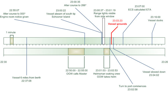 This left the OOW alone on the bridge and steering the vessel as it completed the turn. The OOW, who found the helm movements difficult to manage, oversteered the intended course to 280.4°, after which it took him approximately one minute to bring the vessel back to a course of 288° by making multiple small helm adjustments. During this time, the flashing light marking the cliffs of Entrée Island would have been visible from the conning position.