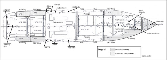 The vessel sustained heavy damage on the starboard side near the bow, quarter, and starboard propeller. The forepeak tank, double-bottom tank No. 1C, as well as starboard tank Nos. 2, 3, 6, and 7, were breached and took on water (see Appendix F). This flooded the Nos. 3, 6, and 7 tanks on the port side by means of the cross-flooding pipes.