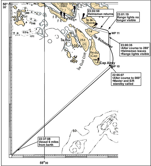 The OOW ordered the helmsman to quickly take the helm, approached the electronic chart, and gave the order to steer 270°. At about the same time, the helmsman saw a rock cliff directly in front of the vessel and applied 20° of port rudder. As the vessel began to turn, it struck Entrée Island at position 50°29.3′ N, 059°27.6′ W at about 2303:30.