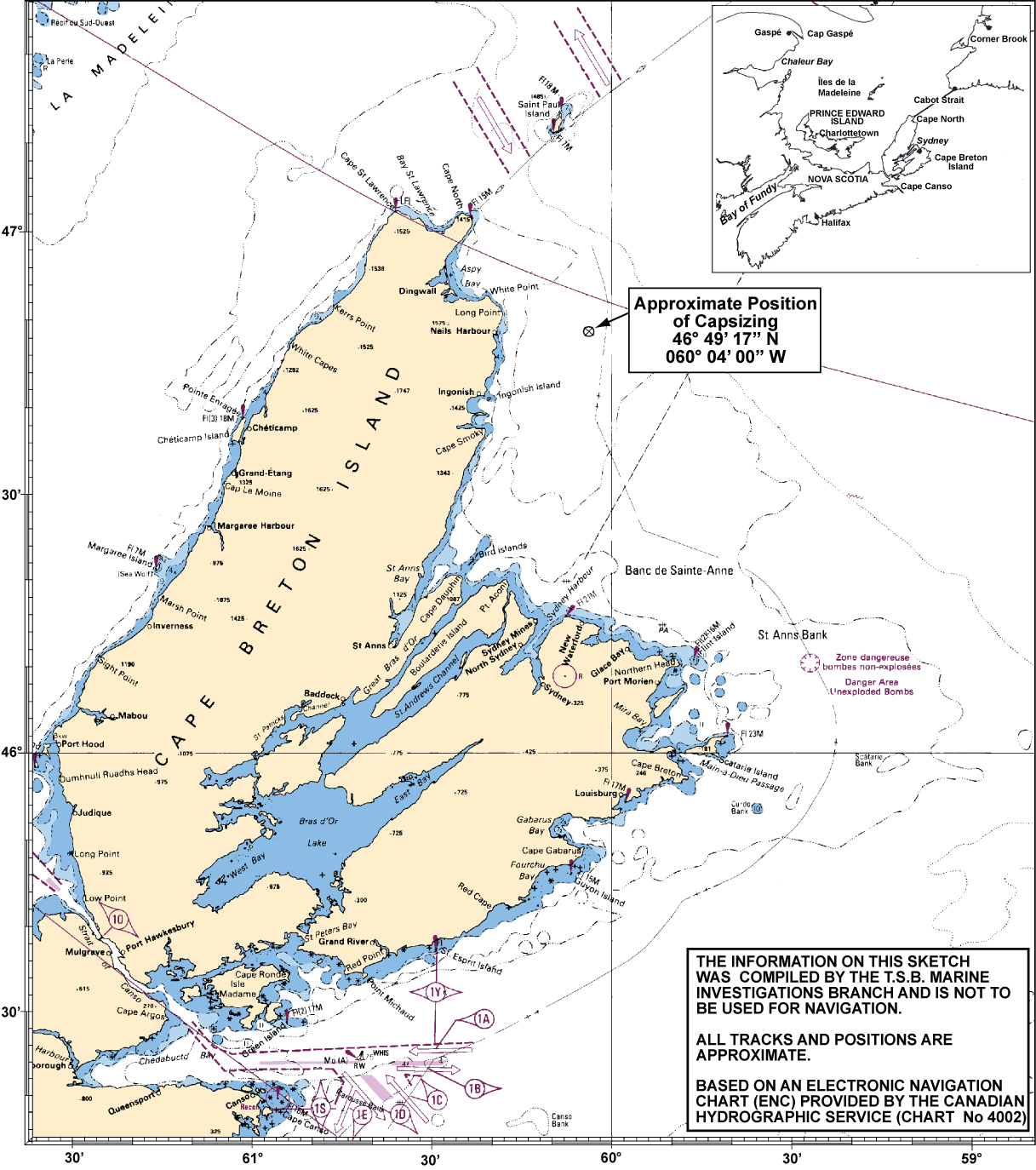 On 26 March 2008 at 1800,Footnote 2 the fishing vessel L'Acadien II with a crew of six departed Cap-aux-Meules, Îles-de-la-Madeleine, Quebec, to participate in the annual seal hunt in the Gulf of St. Lawrence. After encountering high concentrations of heavy ice that evening, the vessel shut down for the night. The next day the CCGS Des Groseilliers, which was in the area in support of the Department of Fisheries and Oceans' (DFO) administration of the annual seal hunt, provided icebreaker assistance by escorting several fishing vessels, including L'Acadien II, toward more navigable ice conditions, within the vicinity of St. Paul Island, Nova Scotia (see Appendix B).