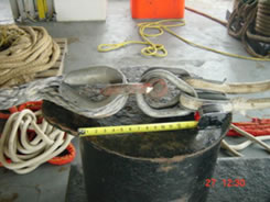 In keeping with normal marine practices for towing in ice, the towline was kept short. The towline consisted of a two-legged bridle, each 15 m in length, shackled to a 38-mm double-braided nylon towing hawser 12 m in length (see Photo 3). Each of the eyes of the 29 mm braided nylon bridle were passed through fairleads and secured over the mooring bitts on the bow (port and starboard) of L'Acadien II.