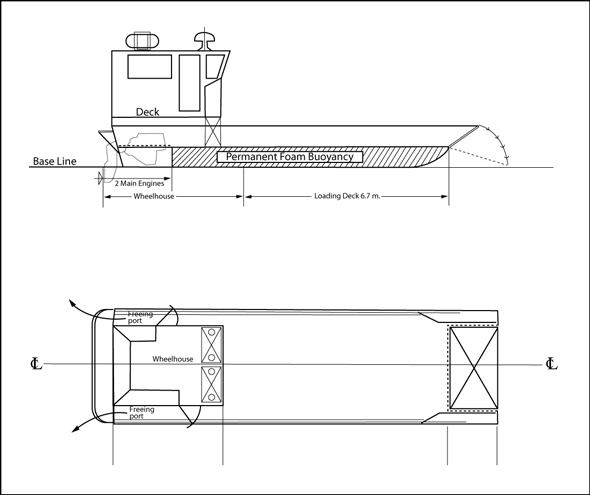The hull is of a box-frame construction. It is fitted with polyurethane foam beams overlaid with heavy duty fibreglass for positive buoyancy. There is no bilge (see Appendix B for general arrangement of vessel).