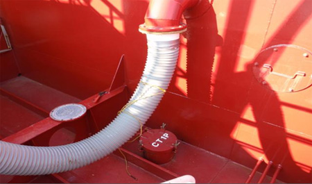 At about 0930, the GPs removed the tank-drying flange covers and hooked one end of the flexible hoses to the tank-drying system (see Photo 2). At 0944, the other ends of the flexible hoses were inserted through the tank-cleaning hatches close to the bottom of tanks No. 1 port and starboard. The GPs then proceeded aft to assist with the pilot transfer.