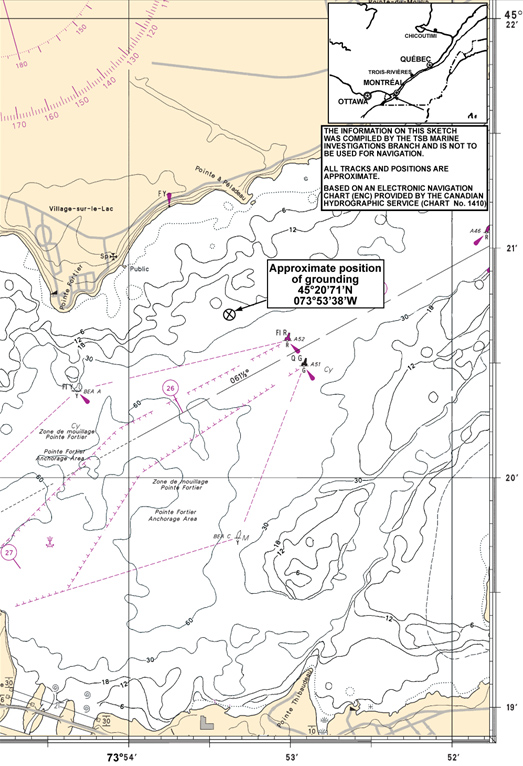 The engine was run at full astern for approximately three minutes, but the turn rate could not be increased and the vessel exited the anchorage, running aground at approximately 1945, four cables northeast of buoy A52Footnote 8 before pivoting to a final heading of 088° G.