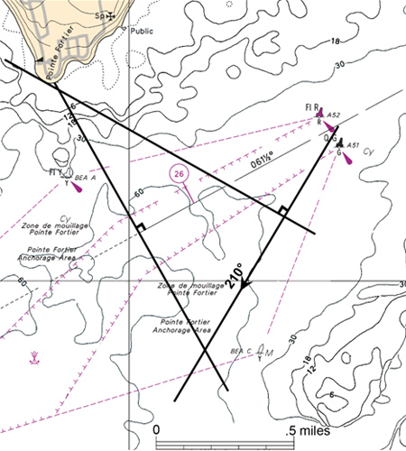 When transiting the anchorage toward Lower Beauharnois Lock, the pilot's practice was to track the vessel's progress using a beam bearing off Pointe Fortier. He identified this location by setting the radar's EBL at 90° to the vessel's course—usually 235° T down the centre of the channel. In this occurrence, however, the usual beam bearing was set relative to the intended port alteration to a course of 210°. This alteration from the normal course through the anchorage area meant that Pointe Fortier would bear abeam much earlier than usual (see Figure 2).