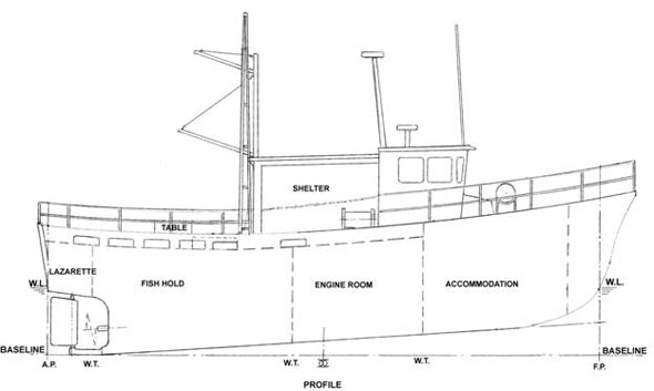 A fuel oil tank is located on each side of the engine room, with a fresh water tank below the accommodation.