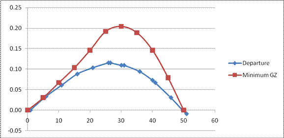 A comparison of the GZ curves in the departure condition for the vessel with the minimum STAB 4 reference criteria provides a clear indication of how limited the vessel's stability was at the time of capsizing: the area under the "departure" line is much smaller than that under the "minimum GZ" line.