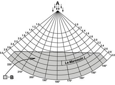 Figure 3 - A: Wave direction. B: Shaded area indicates risk for surfing.