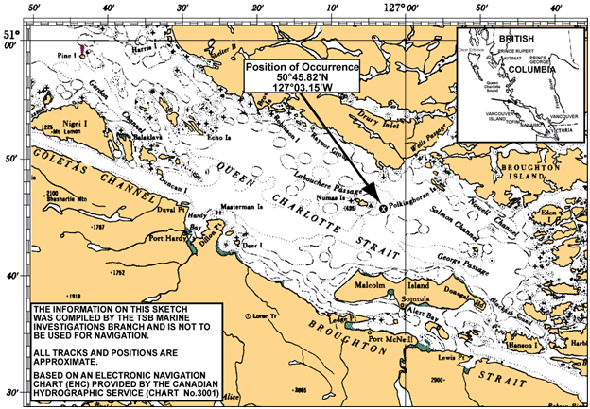 The marine forecast for Queen Charlotte Strait at the time of the occurrence was for northwest winds of 10 to 20 knots. Local observations at the time of the occurrence were light winds and clear visibility.