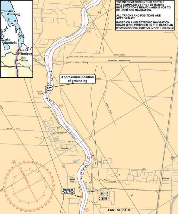 The superintendent at the St. Andrews lock received the call from the River Rouge about an hour after the grounding. He later contacted the CCG base in Gimli. The CCG was not aware of the occurrence and requested that the PWGSC workboat SpoonbillFootnote 8 be tasked to assist. At 1150, the Spoonbill departed to assist the River Rouge. The CCG advised the Royal Canadian Mounted Police (RCMP) and TC. The Joint Rescue Coordination Centre (JRCC) in Trenton, Ontario, and the RCMP and TC in Manitoba subsequently contacted the owner's representative to find out more about the situation on board. The JRCC subsequently coordinated the search and rescue (SAR) response.