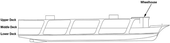 The River Rouge is a steel-hulled passenger vessel with a shallow draught and large breadth-to-depth ratio. It has 3 decks (see Appendix B). The lower and middle decks are for passenger use while the upper deck houses lifesaving appliances, a fuelling station, and potable water reservoirs. There is a walkway around the middle deck protected by railings. The vessel is powered by 2 diesel engines with twin screws and rudders, and is equipped with 2 anchors at the bow. The main hull is subdivided by 7 transverse bulkheads.