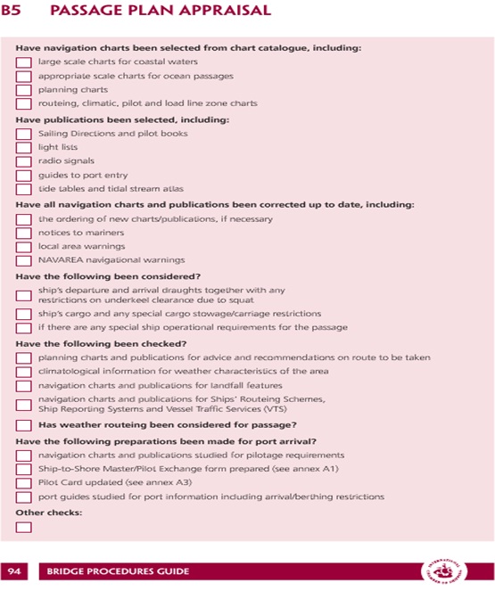 However, the 1–page form did not indicate that the 4 stages of voyage planning were completed by the bridge team, nor did it contain information indicating that the ICS Bridge Procedure Guide was used as a guideline for the voyage planning, as referenced in the company QSEP. The completed form does not indicate that the bridge team complied with the company QSEP, nor does it indicate that the team used the voyage planning appraisal form from the ICS Bridge Procedures Guide. The Bridge Procedures Guide lists voyage planning steps including the requirement to access local marine safety information and local warnings (Appendix B).