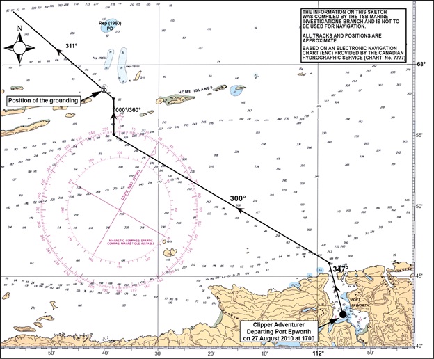 On 14 August 2010, the Clipper Adventurer embarked 128 passengers and departed from Kangerlussuaq, Greenland, bound for Kugluktuk, Nunavut, on a scheduled 2–week Arctic cruise. A bridge watch system of 4 hours on, 8 hours off was shared between the 3 bridge watch officers. There was a quartermaster assigned to each watch who, in addition to his other duties, acted as a lookout. The master's schedule was not fixed since he was required to be available as necessary throughout the voyage. The Clipper Adventurer was transiting in surveyed areas for most of the voyage. On day 13, however, the Clipper Adventurer transited between Bathurst Inlet and Port Epworth, an area that was largely unsurveyed, consisting primarily of single lines of soundings.