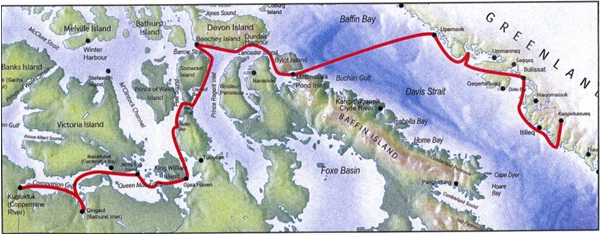 | Route | Approximate distance (nm) | Speed required (knots) | Time required (hours–min) to reach destination (Kuglugtuk, NU) |