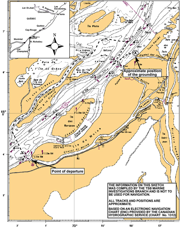 Unaware of the vessel's position relative to the buoy, the master stopped the engines. The vessel drifted for a few minutes until, at 1435, while still in the squall, it grounded in mud at the entrance to Rigolet des Chenaux, in position 46° 06′ 24″ N, 072° 57′ 58″ W.