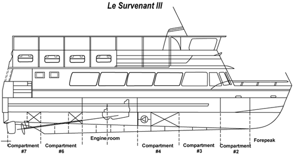 Le Survenant III is a small, 2-deck passenger vessel of closed welded aluminum construction with a transom stern (see Photo 1 and Appendix B). The navigation bridge is located at the forward end of the upper deck. The upper deck windows are hinged to swing down in case of inclement weather (see Photo 2) and are not weathertight. The vessel is powered by twin diesel engines, with twin screws and rudders. The vessel is also equipped with 2 anchors at the bow.