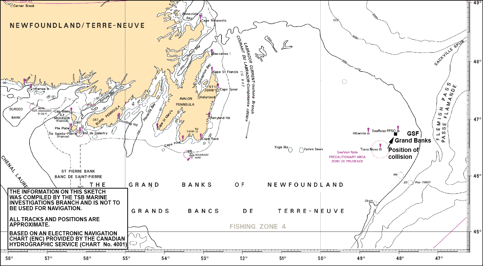 On 14 November 2011, the Maersk Detector departed St. John's, NL and proceeded to the GSF Grand Banks, which was moored on 8 anchors and engaged in drilling operations on the Grand Banks of Newfoundland at the White Rose oil field operated by Husky Oil Operations Limited, (Appendix C). The Maersk Detector arrived at the field on 15 November to provide standby and supply vessel services.