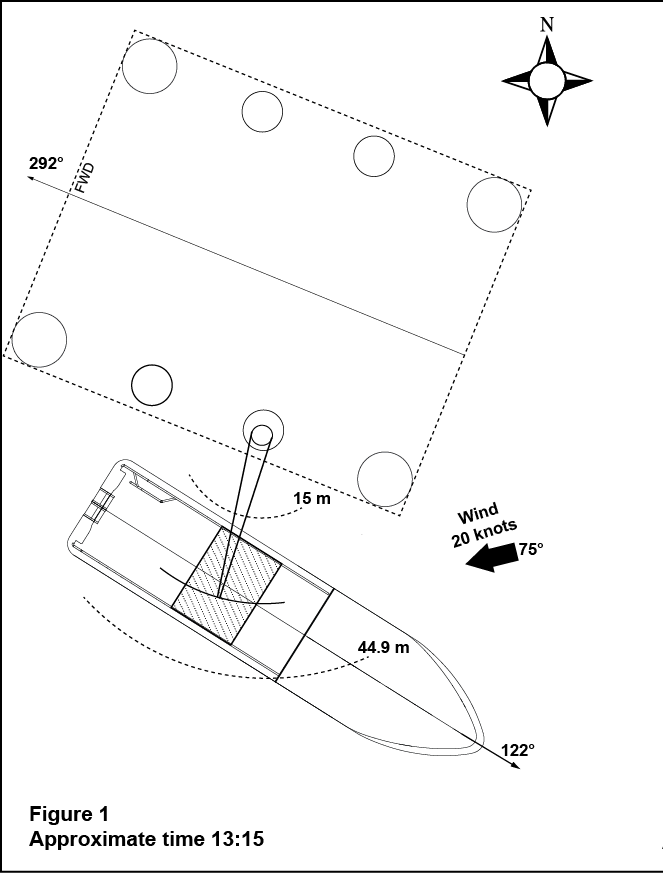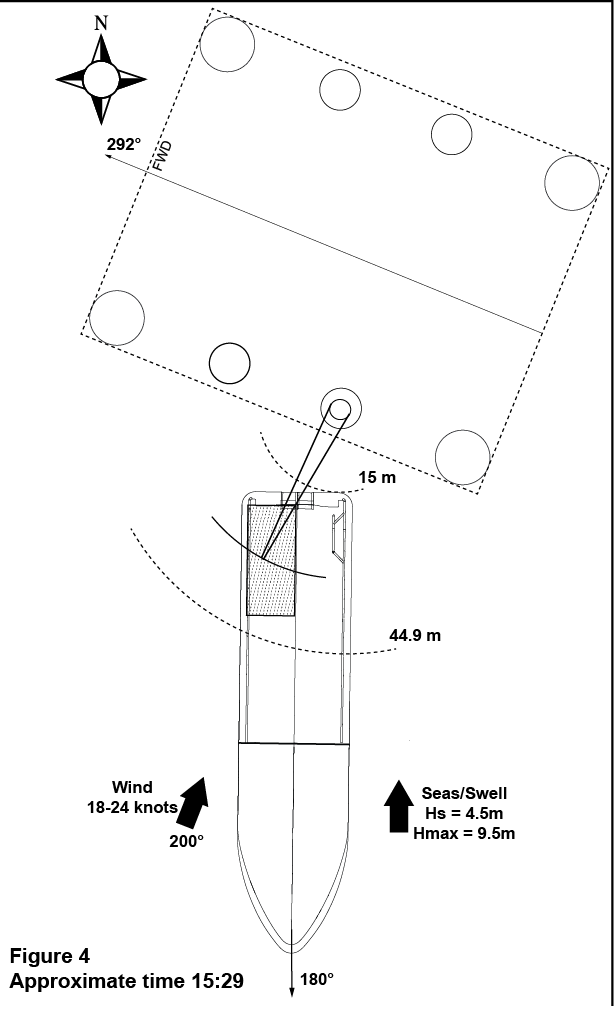 At about 1315, the Maersk Detector was about 15 m off the lee side of the rig on a heading of 122°true (T) (Appendix D, Figure 1) and around 1330 commenced loading containers on deck. Between 1330 and 1400 the wind shifted from a northerly to the southeasterly direction, with the rig port side changing accordingly from lee side to weather side.Footnote 16 There was no formal briefing or risk assessment conducted for this weather-side operation.