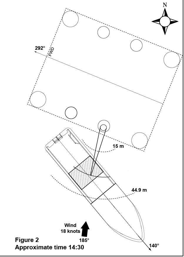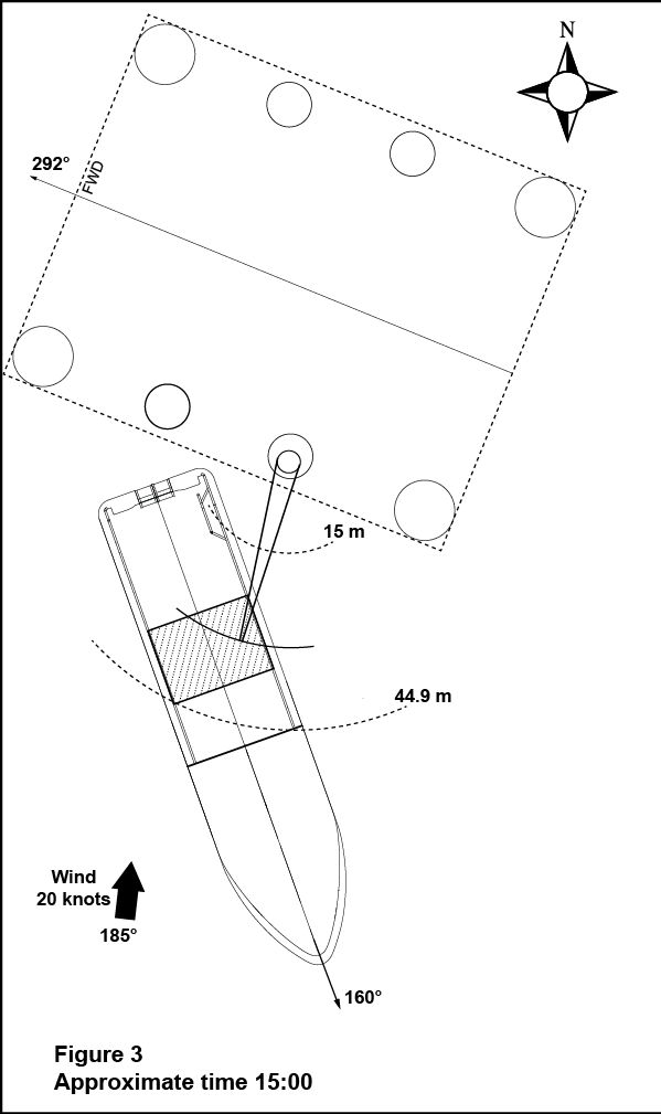 The master then began repositioning the vessel for the final load, towards a position 15 m off the rig. For approximately the next 5 minutes, the voyage data recorder (VDR) data indicates that the distance between the vessel and rig was increasing and decreasing in an oscillatory manner (Appendix E). At around 1529, the master advised the crane operator that he was in position and ready to load.