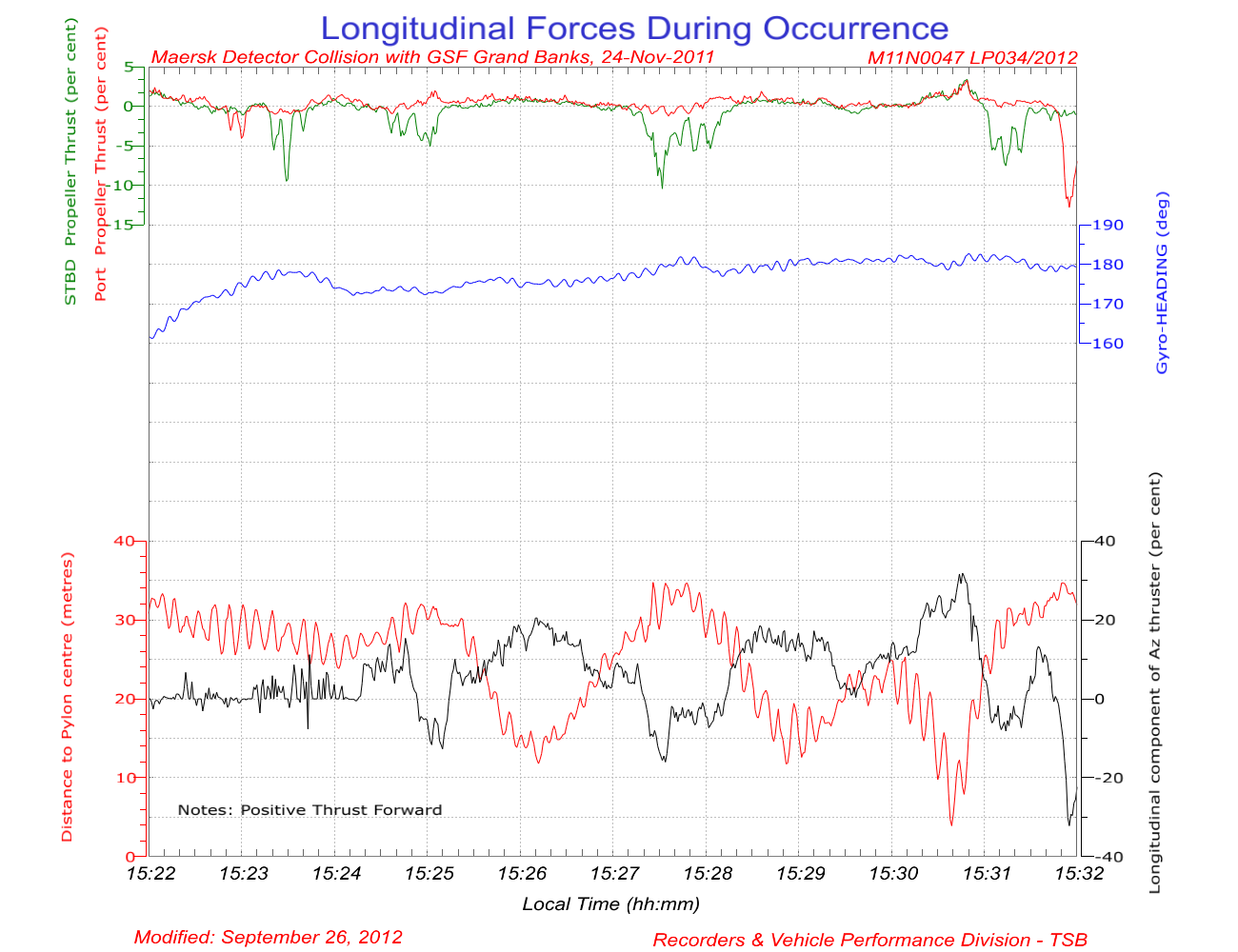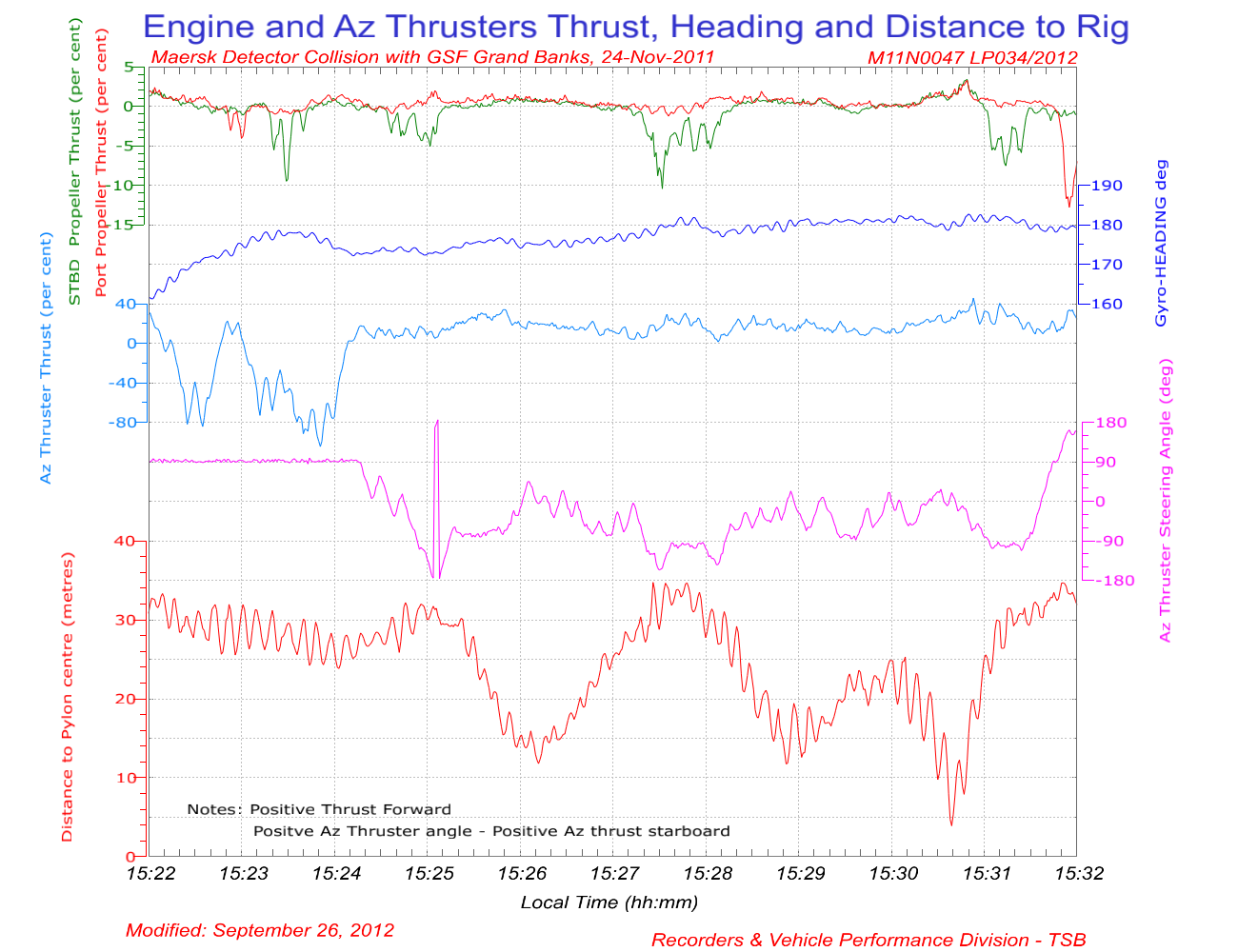Nonetheless, for a period of approximately 6 minutes prior to the striking (after the heading change to 180°) the station-keeping of the Maersk Detector was unsteady, with the VDR position data exhibiting the vessel's oscillatory motion towards and away from the rig. The final movement of the vessel towards the rig could therefore be expected. Furthermore, the VDR data for thrust and separation distance were 180° out of phase with each other. This is indicative of a coupling effect whereby the operator input (in this case the DP control system or the master) is driving the motion of the vessel into an undesirable state. The investigation considered the following factors as possible causes of this coupling effect: