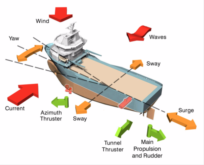 - Auto Position mode: a mode in which the system automatically maintains the heading and position of the vessel (all 3 axes). The user inputs the initial desired position setpoint and maximum speed to use when manoeuvring to the setpoint. Once the desired setpoint has been reached, the DP system controls the thrusters to maintain that setpoint position.